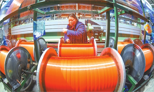A worker produces nets at a workshop in Lianyungang, East China's Jiangsu Province, on January 6, 2026. Local factories have been bustling for several days at the beginning of the new year to ensure a strong start. In December, the nationwide Purchasing Managers Index for the manufacturing sector rose 0.9 from the previous month to 50.1, returning to expansion territory. Photo: VCG
